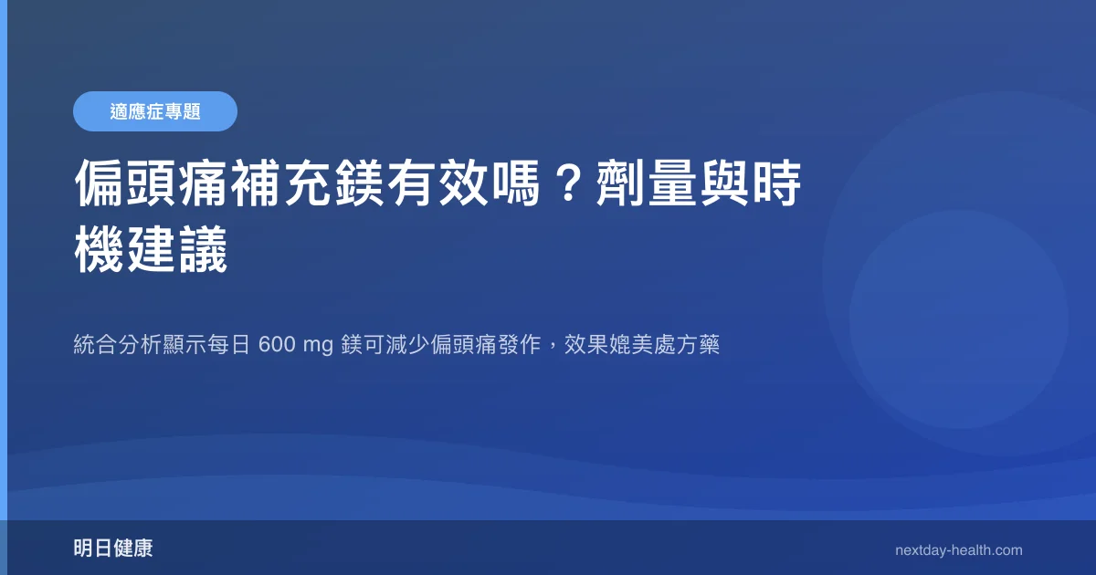 統合分析顯示,每日補充 600 mg 元素鎂可減少每月 1–2 次偏頭痛發作,且持續補充 8 週以上效果更穩定(Chiu et al., 2016)。鎂作為偏頭痛的輔助預防選項,近年累積了相當程度的臨床證據。身為長期處理頭痛患者的醫師,我想跟你聊聊鎂在偏頭痛預防上的實際角色——什麼時候該考慮、怎麼吃、能期待什麼效果。