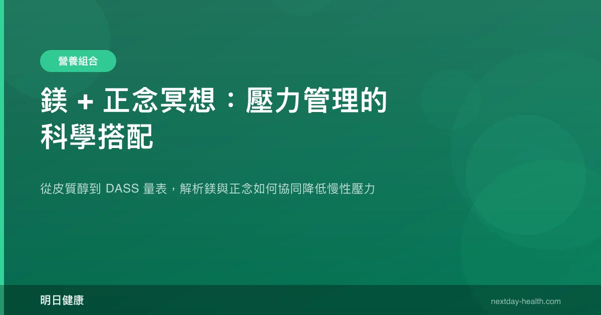 - 雙路徑降低皮質醇:正念降低心理壓力感知 → 減少皮質醇分泌;鎂穩定 HPA 軸 → 降低皮質醇基線。