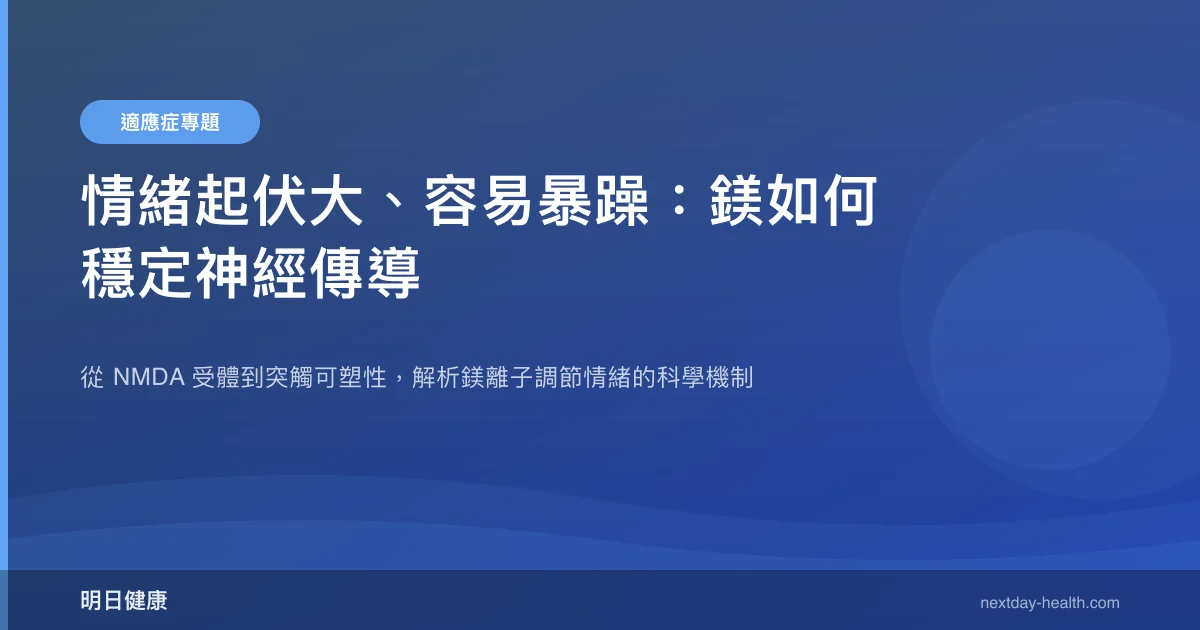 當體內鎂含量不足時,NMDA 受體上原本由鎂離子「把守」的閘門會失去控制,導致過多的鈣離子湧入神經細胞。這種過度興奮的狀態,在日常生活中的表現就是焦躁不安、情緒波動劇烈,甚至出現失眠和注意力不集中的問題。