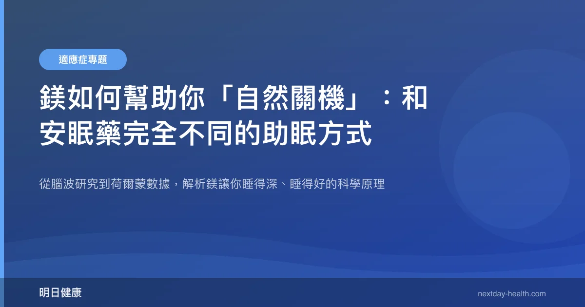 台灣每 5 個成年人就有 1 人受失眠困擾,而多數人第一個想到的解法是安眠藥。但安眠藥透過強制抑制中樞神經來「擊昏」大腦,隔天常伴隨頭暈、注意力渙散等宿醉感。鎂(magnesium)走的是完全不同的路線——它不是把你的大腦「關機」,而是幫大腦「自然降速」,讓身體回到本來就該有的入睡節奏。