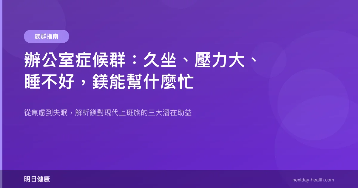 He 等人(2025)的機轉回顧進一步解釋,鎂缺乏會縮短有效睡眠時間並損害睡眠品質,而鎂透過調節細胞生物時鐘和能量平衡來影響睡眠覺醒周期。對於經常加班、作息不規律的辦公室工作者而言,維持足夠的鎂攝取可能有助於穩定被打亂的生理時鐘。