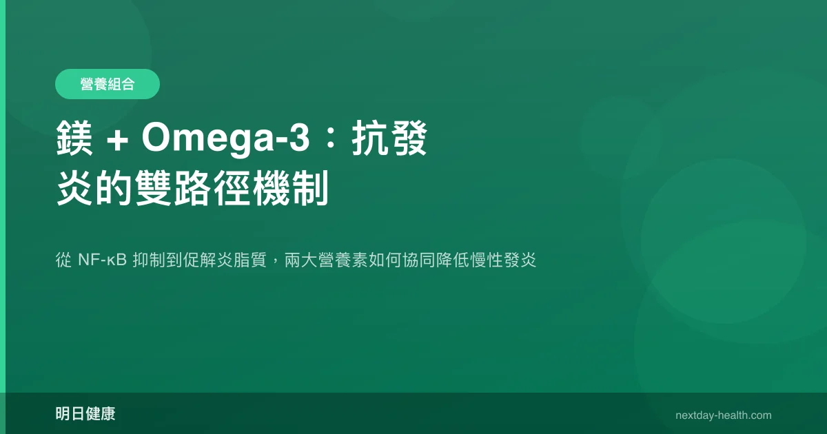 慢性低度發炎是心血管疾病、代謝症候群與神經退化性疾病的共同底層機制,單一營養素往往只能作用於發炎級聯反應的某一段。系統性回顧與統合分析顯示,鎂補充可顯著降低 C 反應蛋白(CRP)水平,展現直接的抗發炎潛力(Cepeda V et al., 2025)。然而,發炎反應涉及多條訊號路徑,從上游的促發炎轉錄因子到下游的脂質介質,僅靠單一礦物質難以全面覆蓋。鎂與 Omega-3 脂肪酸恰好作用於不同的分子節點:鎂主要透過抑制 NF-κB 與改善代謝功能來「減少促發炎訊號」,而 Omega-3(尤其是 EPA)則透過產生專門的促解炎脂質介質(specialized pro-resolving mediators, SPMs)來「加速發炎消退」。這種互補的雙路徑機制,正是兩者合併使用的科學基礎。