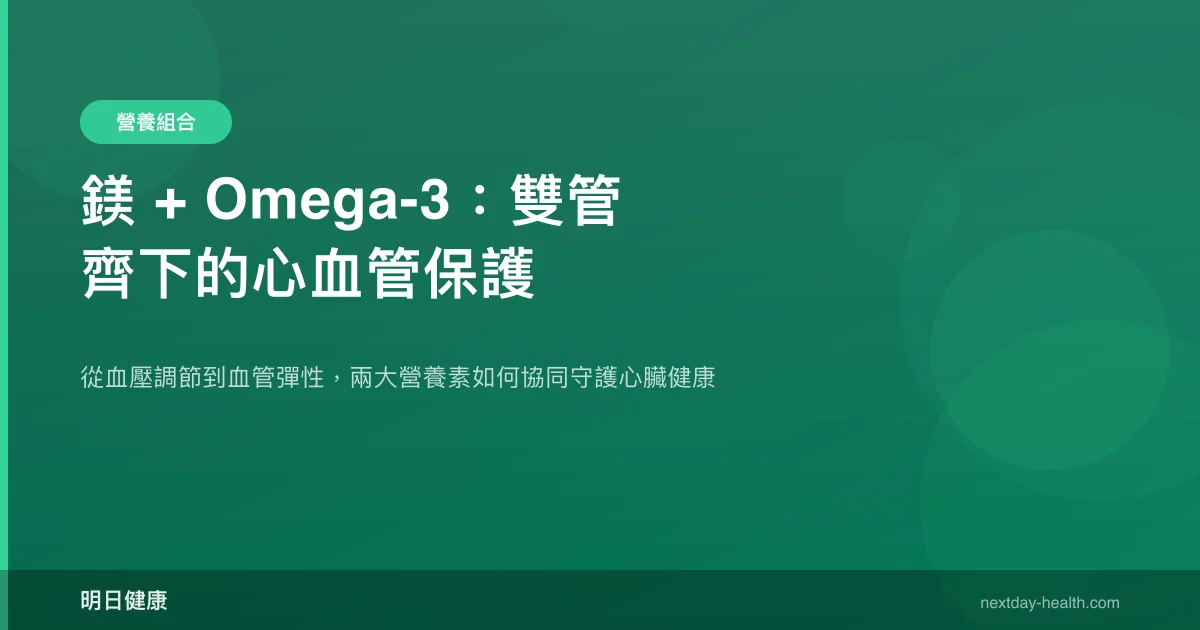 值得注意的是,Omega-3 的心血管保護作用與鎂的降壓機轉並不重疊,兩者各自針對不同的風險因子發揮效用。這正是「雙管齊下」策略的理論基礎——多靶點營養介入往往比單一營養素的效果更為全面。