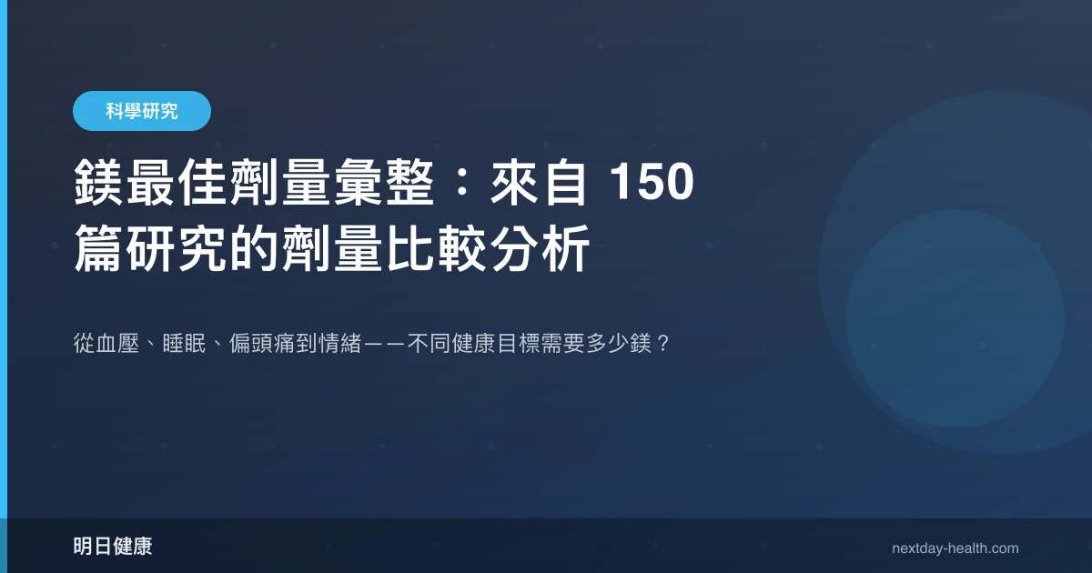 鎂是人體超過 300 種酵素反應的必需輔因子,但全球約 50% 人口的每日鎂攝取量未達建議量。近年多篇統合分析與隨機對照試驗陸續釐清了鎂在不同健康領域的有效劑量範圍,本文彙整 6 篇關鍵研究的劑量數據,為讀者提供以證據為基礎的劑量參考框架。