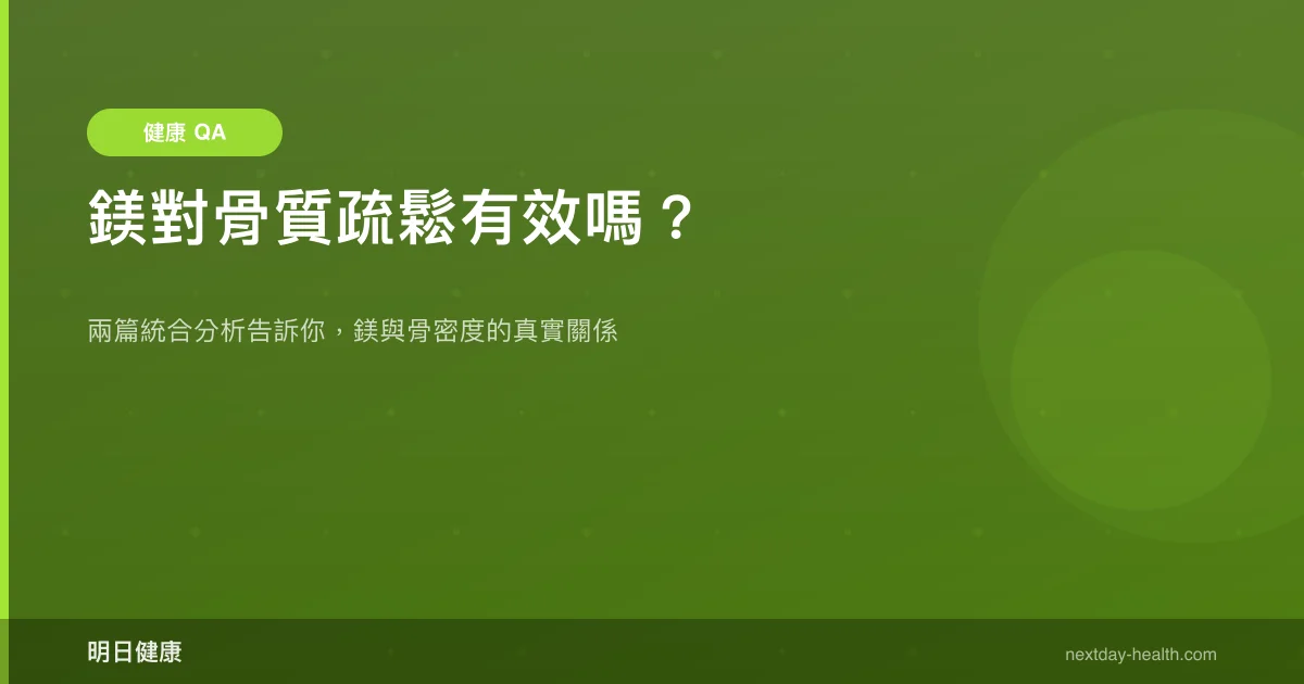 目前證據顯示:飲食中攝取足夠的鎂,確實與較高的骨密度正相關,但「補鎂就能治療骨鬆」這句話說得太滿了。2022 年一篇涵蓋多項研究的統合分析發現,鎂攝取量較高的族群,髖部骨折風險有下降趨勢,股骨頸與全髖的骨密度也比較好(Groenendijk et al., 2022)。不過,目前介入性研究(也就是真的「補鎂看效果」的實驗)數量還不夠多,證據力有限。