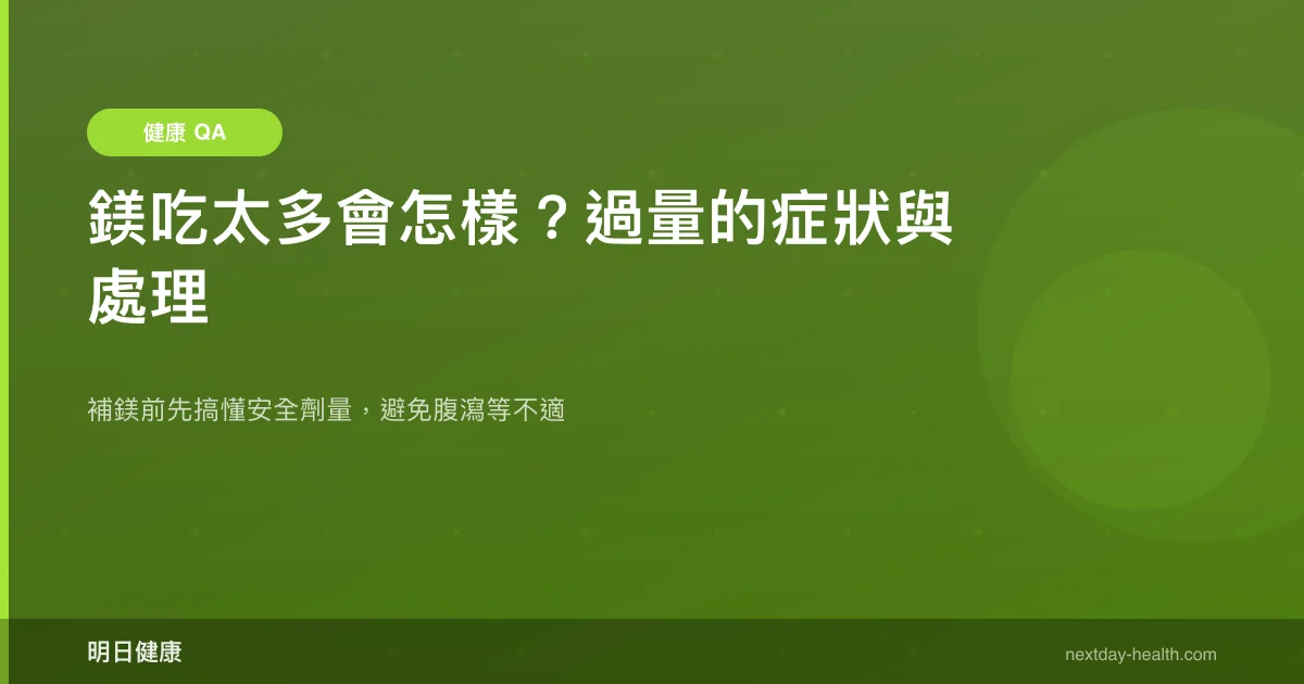 短答:腎功能正常的人,鎂吃太多最常見的反應就是拉肚子,通常停掉或減量就會好。但腎功能不好的人要特別小心,嚴重高鎂血症可能影響心臟和呼吸。