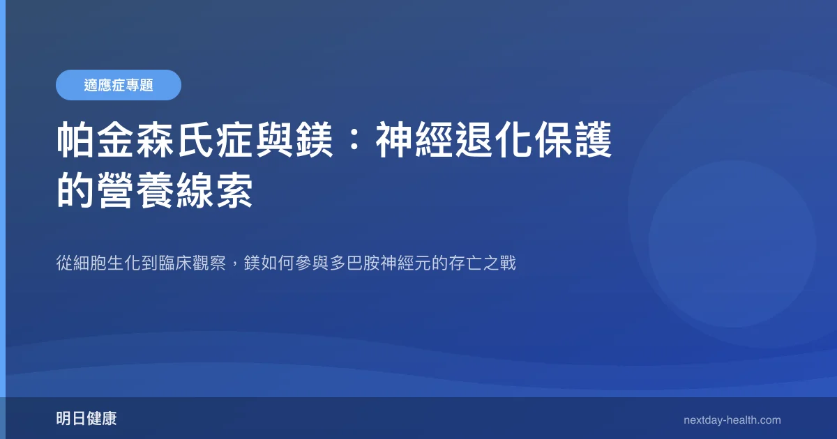 鎂作為人體超過 300 種酵素的輔因子,近年研究顯示其在帕金森氏症等神經退化疾病中可能扮演保護角色,但目前證據仍以基礎研究與回顧文獻為主,尚無大型隨機對照試驗直接證實補鎂能延緩帕金森病程。這篇文章將從神經科門診的視角,帶你理解鎂與帕金森氏症之間的科學線索。