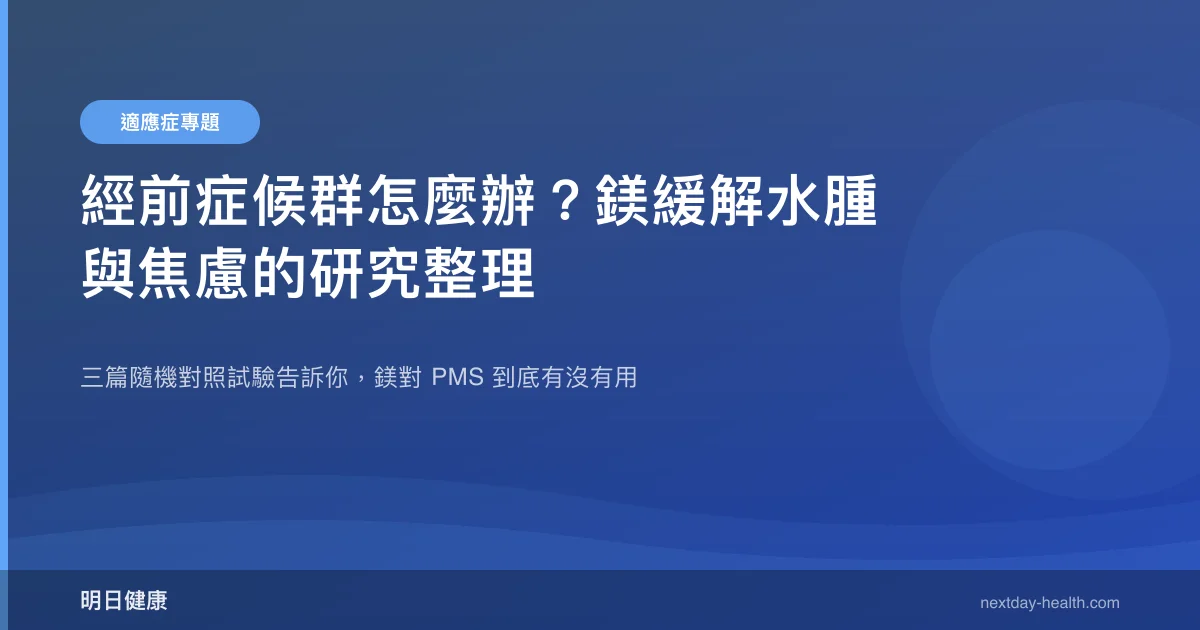 經前症候群(PMS)是指在月經來潮前 1-2 週出現的一系列生理與心理症狀,包括水腫、焦慮、乳房脹痛與情緒波動,影響約 75% 的育齡女性。面對這些反覆出現的不適,許多人開始關注營養補充的可能性——其中,鎂(magnesium)是近年研究最多的礦物質之一。本文整理三篇隨機對照試驗(RCT)的結果,帶你了解鎂在緩解 PMS 上的實際表現。