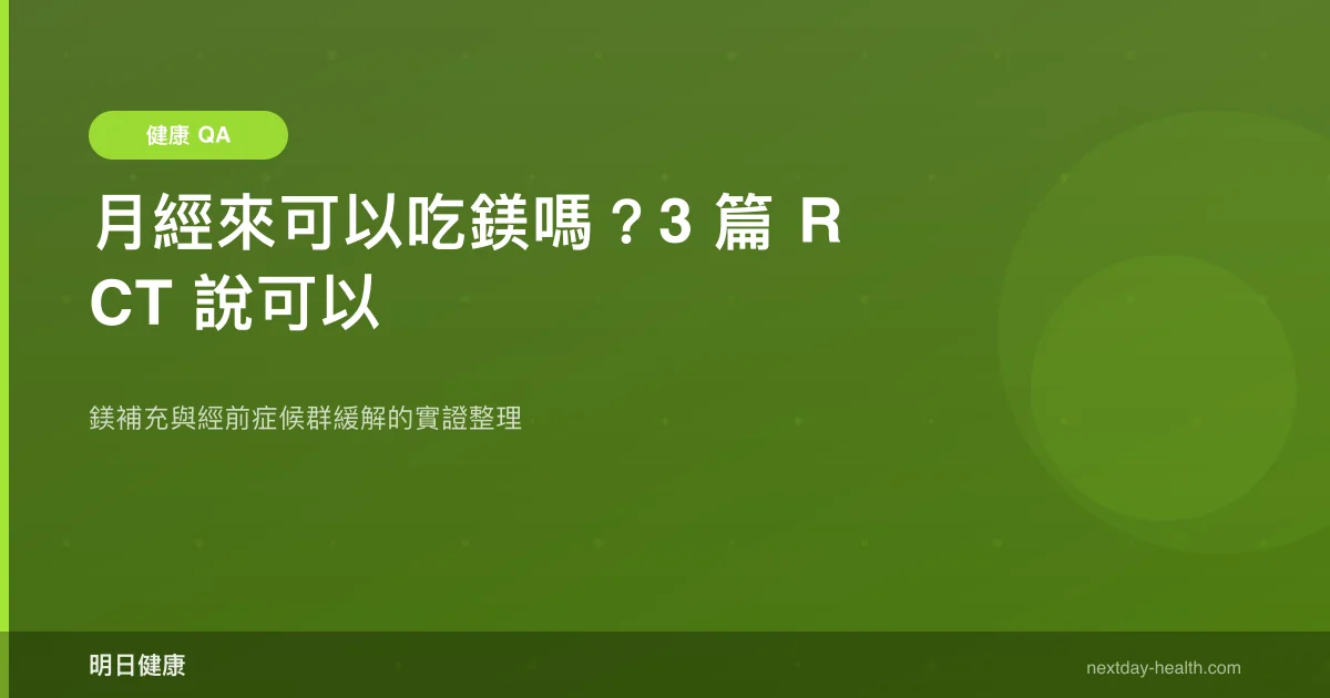 可以,而且建議整個月經週期都吃,不是只有月經來那幾天。三篇隨機對照試驗(RCT)都顯示,持續每日補充鎂能緩解經前症候群(PMS)的多種不適。