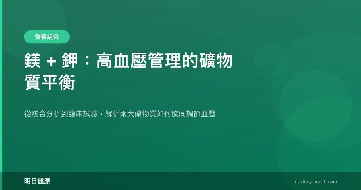 - 每日鎂攝取增加 100 mg,高血壓風險降低約 5%(統合分析,Han et al., 2017)
