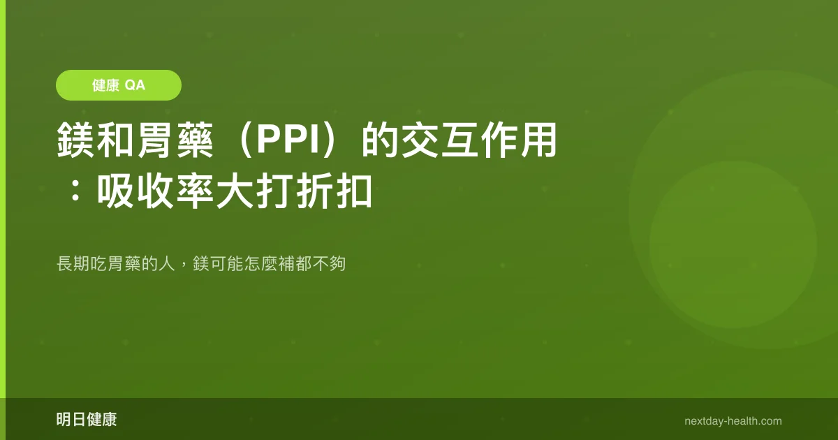 長期服用質子幫浦抑制劑(PPI)會顯著降低鎂的吸收率,研究顯示低鎂血症在一般人群盛行率高達 15%,而 PPI 使用者風險更高。如果你正在吃胃藥又想補鎂,這篇幫你搞清楚到底怎麼回事。