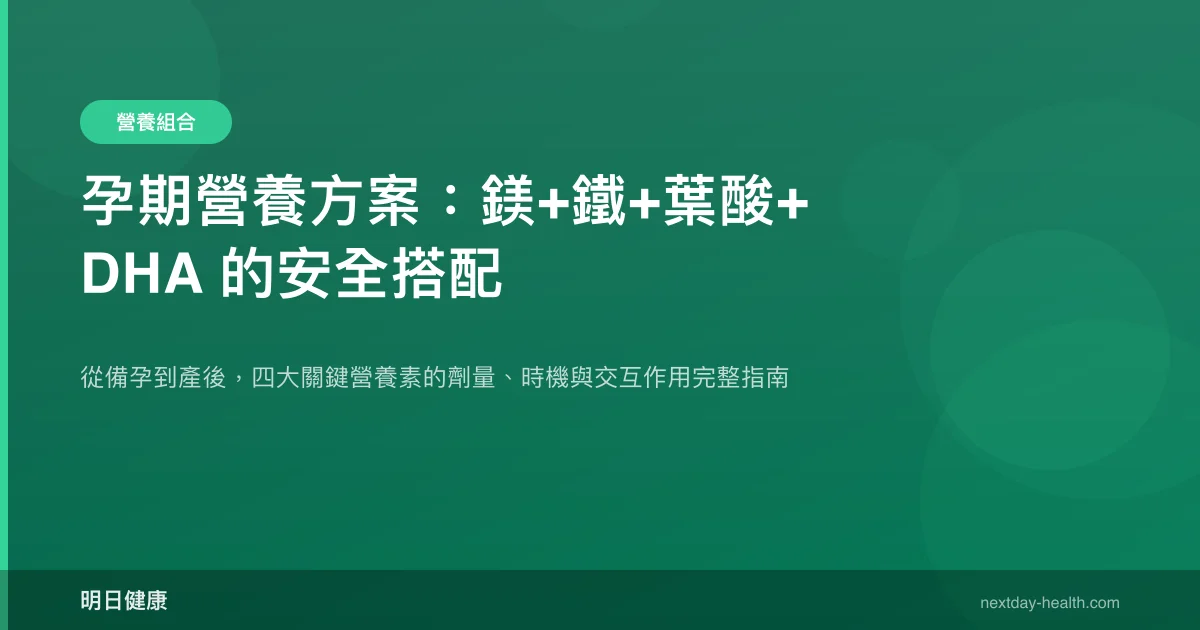 | 備孕期(孕前 1–3 個月) | 葉酸 > 鎂 > DHA > 鐵 | 葉酸提前補充預防 NTD;鎂儲備基礎量 |
