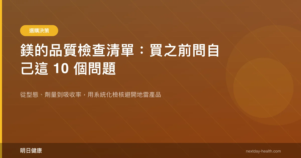 系統性回顧研究顯示,有機鎂鹽的生物利用度顯著優於無機鎂鹽,其中檸檬酸鎂的吸收率約為氧化鎂的 24 倍(Pardo et al., 2021)。這代表你買到的「鎂含量」和身體實際吸收的鎂,可能是完全不同的數字。以下 10 個問題,幫你在結帳前做出明智判斷。