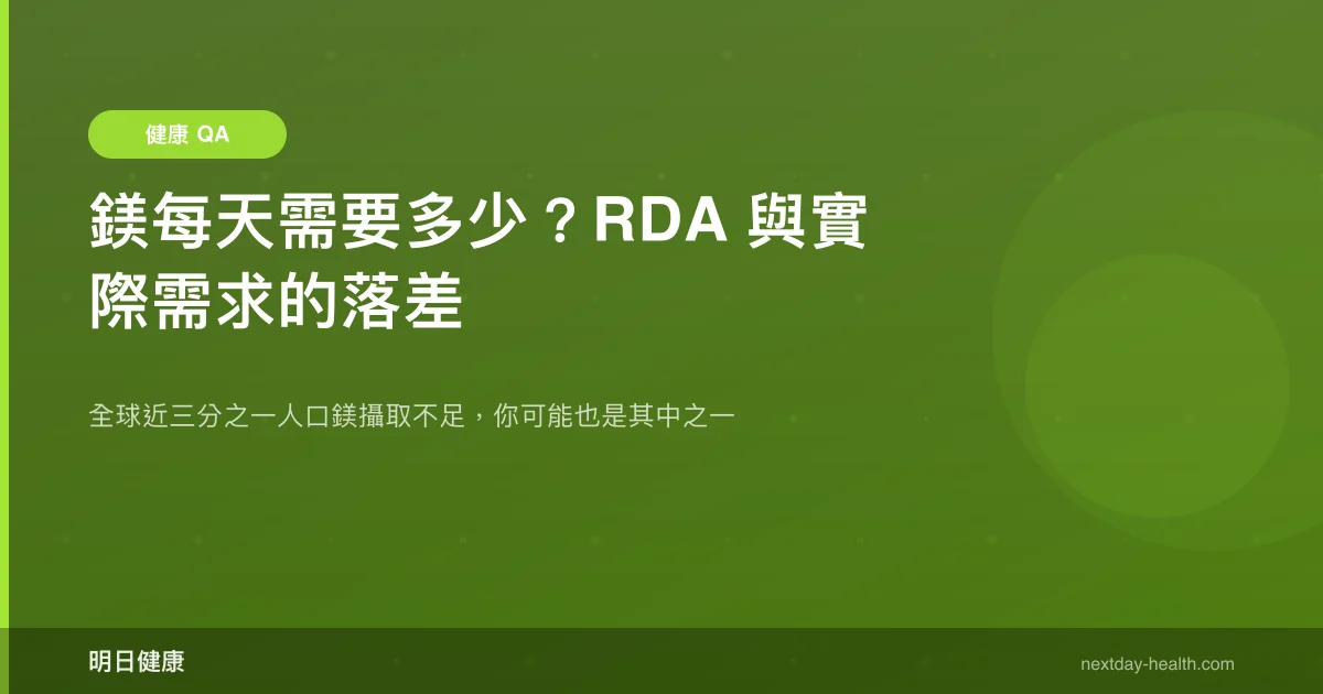 台灣成人男性每日建議攝取量(RDA)為 380 mg,女性為 320 mg。這個數字是根據代謝平衡研究設定的「大多數人足夠」的量。但問題來了——RDA 是「不缺」的底線,不等於「最佳」攝取量。部分研究者認為,考量現代人的壓力與慢性發炎狀態,實際最佳需求可能更高。