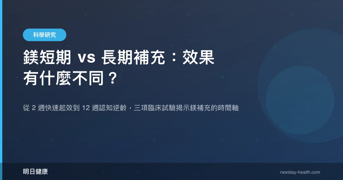 臨床證據顯示,鎂補充最快 2 週即可觀察到情緒改善趨勢,但認知功能的顯著提升則需要 12 週以上的持續補充。這個時間差異並非偶然——不同生理系統對鎂的反應速度截然不同,理解這條時間軸,能幫助你設定合理的期待值。
