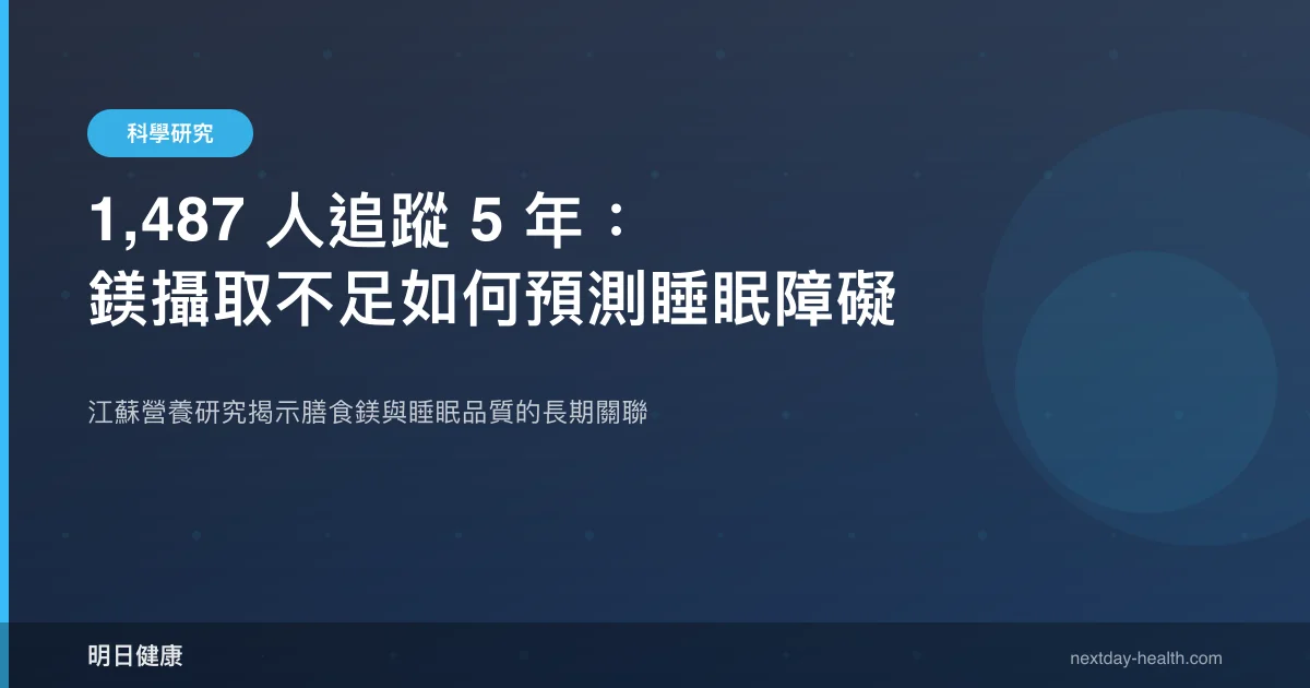膳食鎂攝取量最低的人,五年後出現睡眠障礙的風險顯著升高。一項追蹤 1,487 名中國成年人長達五年的前瞻性世代研究(Cao et al., 2018)發現,鎂攝取處於最低四分位數的受試者,相較於攝取量最高者,睡眠障礙症狀的風險明顯增加。這項研究的核心價值在於:它不只是一張橫斷面快照,而是透過長期追蹤,確認了鎂攝取不足在「前」、睡眠問題在「後」的時序關係。