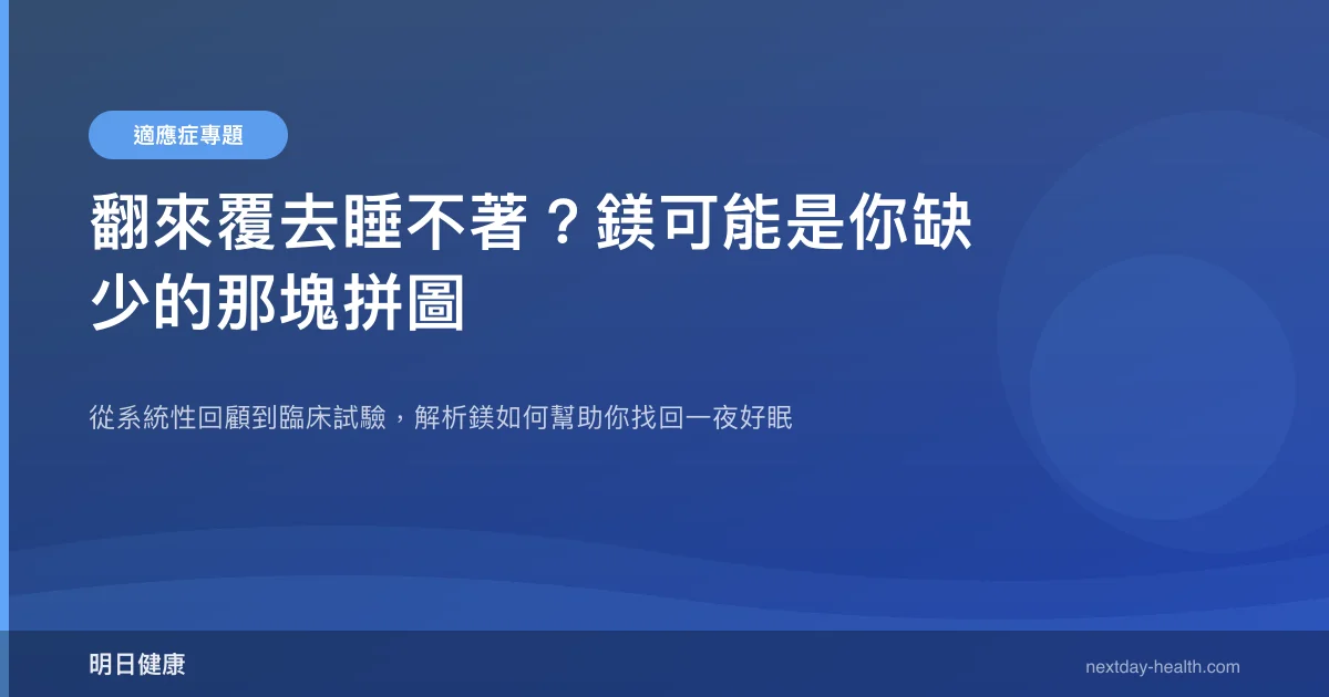 綜合三項研究證據顯示,補充鎂可改善主觀睡眠品質並縮短入睡時間約 17 分鐘,尤其對老年人及鎂攝取不足者效果更明顯。如果你經常在床上翻來覆去,這個平凡的礦物質或許值得你認識一下。