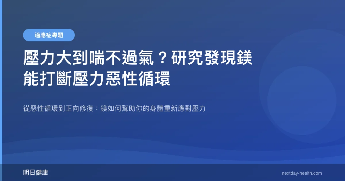 研究顯示,每日補充 300 mg 以上的元素鎂,能顯著降低主觀壓力量表分數,尤其在鎂攝取不足的族群效果更為明顯。你可能不知道,壓力與鎂之間存在一個惡性循環——壓力越大,身體消耗的鎂越多;鎂越不夠,壓力反應又越劇烈。這篇文章將帶你了解這個循環如何運作,以及科學家找到了什麼方法來打斷它。