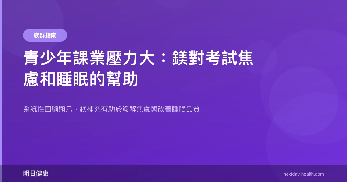 台灣國中及高中生的鎂攝取量普遍低於每日建議量,與課業壓力、外食比例高、含糖飲料攝取過多直接相關。鎂是人體超過 300 種酵素反應的必要輔因子,參與神經傳導、肌肉放鬆與能量代謝。當身體處於壓力狀態時,腎臟會加速排出鎂,形成「壓力越大→鎂流失越多→抗壓力越差」的惡性循環。青少年正值快速發育期,骨骼生長與荷爾蒙變化都會增加鎂的需求量,偏偏這個年齡層的飲食型態最不利於攝取足夠的鎂。
