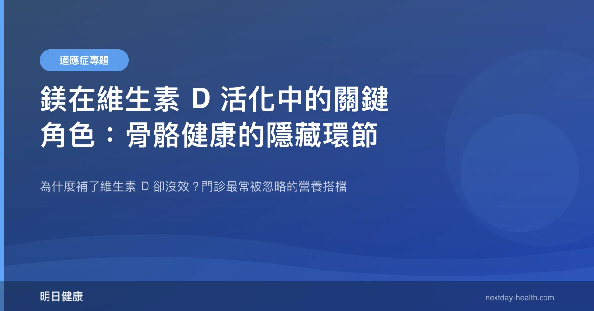 鎂是維生素 D 在體內活化的必要輔因子,缺乏鎂時即使維生素 D 攝取充足,代謝轉化效率仍會顯著降低(Uwitonze et al., 2018)。在骨科與內分泌門診中,我經常遇到患者困惑地問:「醫師,我每天都有吃維生素 D,為什麼骨密度還是沒改善?」答案往往藏在一個被忽略的礦物質——鎂。