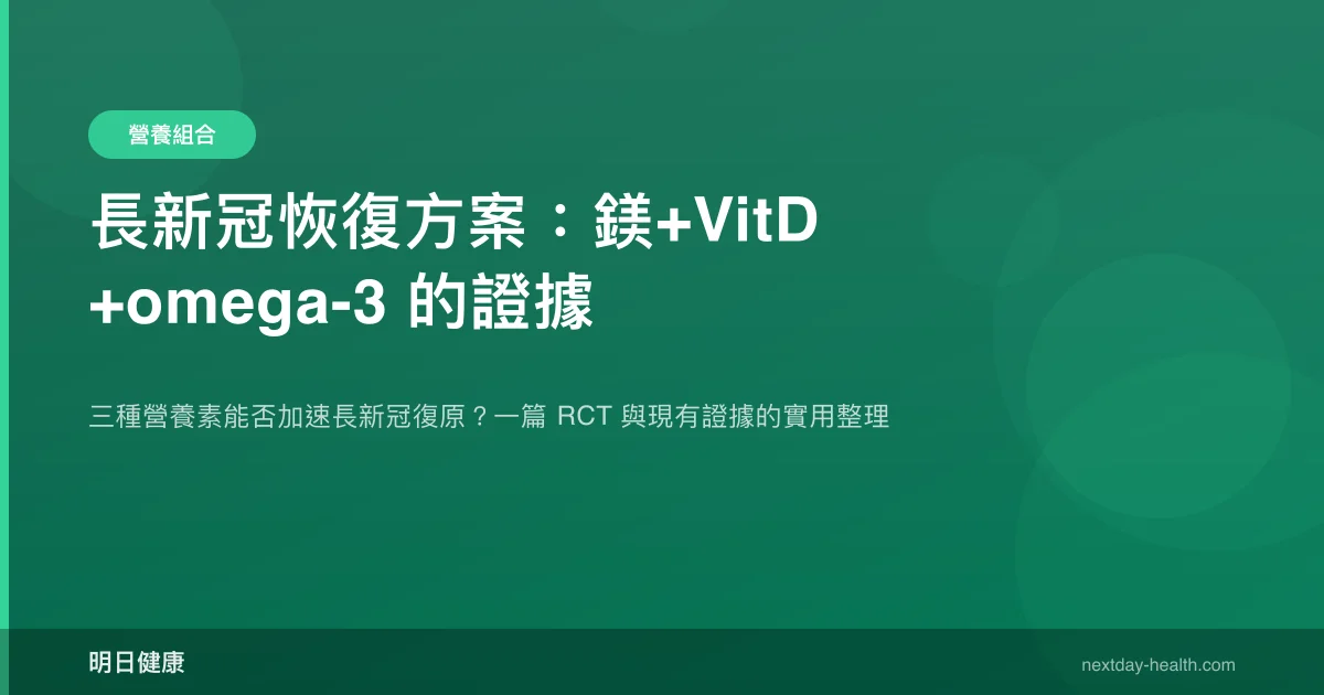 然而必須誠實指出:目前僅有鎂+維生素 D 的組合獲得 RCT 等級的長新冠證據支持。omega-3 對長新冠的直接臨床試驗仍非常有限,現有推論多來自其在一般發炎與情緒障礙領域的研究外推。三者合併使用的整合性 RCT 目前尚未發表。