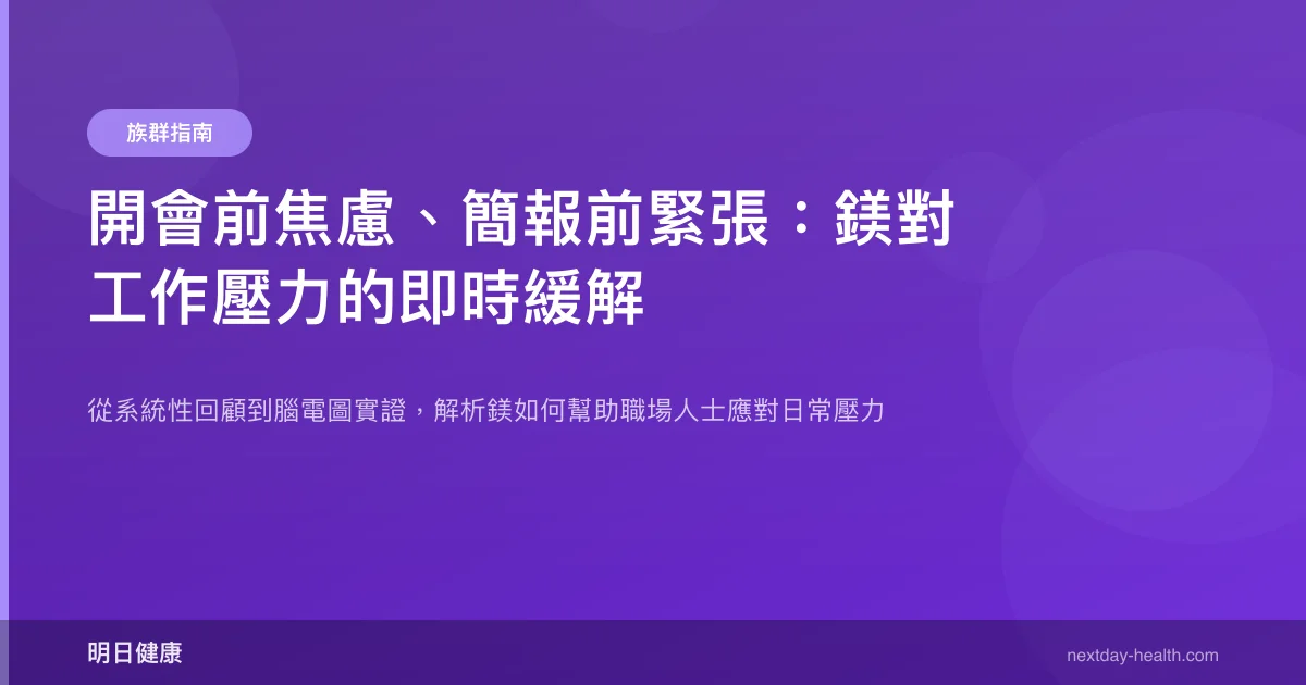 系統性回顧指出,多數研究使用的劑量介於 200-400 mg/天,但研究者認為最佳劑量可能落在 400-600 mg/天,這暗示過去研究可能低估了鎂的實際效果。以下是職場情境的實用建議: