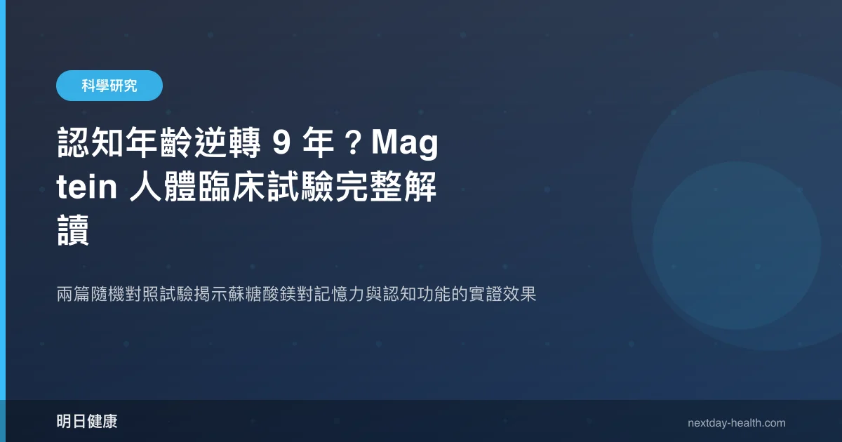 - 2016 年隨機對照試驗(RCT)顯示,補充蘇糖酸鎂 12 週後,受試者認知腦齡平均逆轉約 9.4 年