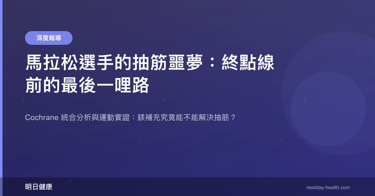 每年全球超過 800 場馬拉松賽事中,約有 39% 的跑者曾在比賽後半段經歷肌肉痙攣,而這個數字在炎熱環境下更可攀升至 67%。當雙腿在第 35 公里處突然鎖死,終點線近在眼前卻無法邁步——這是無數長跑選手最深刻的噩夢。鎂,這個被運動圈奉為「抗抽筋礦物質」的營養素,真的能成為救贖嗎?一篇納入 11 項隨機對照試驗的 Cochrane 統合分析給出了令人意外的答案。