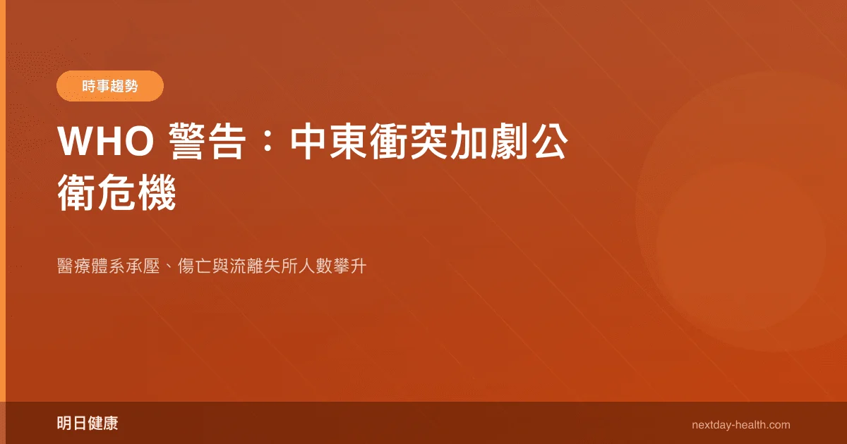 世界衛生組織(WHO)發出警告,中東地區持續衝突正使當地公共衛生危機急劇惡化,醫療體系面臨嚴峻壓力,傷亡與流離失所人數持續攀升。WHO 呼籲國際社會加強人道支援,以避免更大規模的健康災難。