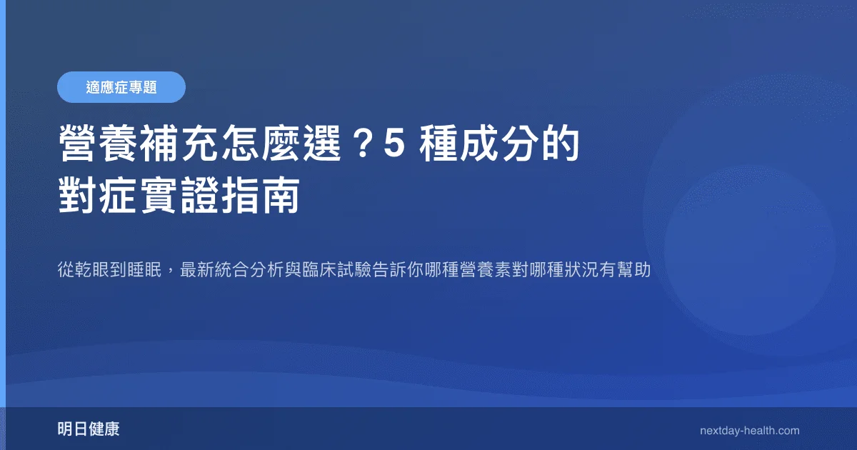 你想補充營養素改善某個健康困擾,卻發現選項多到眼花撩亂?維生素 D、鎂、色胺酸、Omega-3、維生素 B12 都是熱門選項,但每一種的「對症能力」並不相同。這篇指南根據最新統合分析與臨床試驗,幫你釐清哪種成分對哪種狀況有實證支持,哪些效果可能被高估。