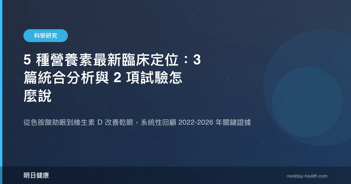 過去五年,針對常見營養素的高品質臨床研究正以前所未有的速度累積。統合分析(meta-analysis)是指將多項獨立研究的數據彙整後進行統計分析的方法,能提供比單一研究更穩健的結論。本文聚焦五種營養素——色胺酸、維生素 D、Omega-3 脂肪酸、鎂與維生素 B12——的最新臨床證據,涵蓋三篇統合分析與兩項臨床試驗,分別涉及睡眠品質、眼部健康、兒童代謝、心血管預後與氧化壓力等面向。這些研究共同描繪出一幅營養素臨床應用的最新定位圖:部分效益獲得強力佐證,部分則仍需謹慎解讀。