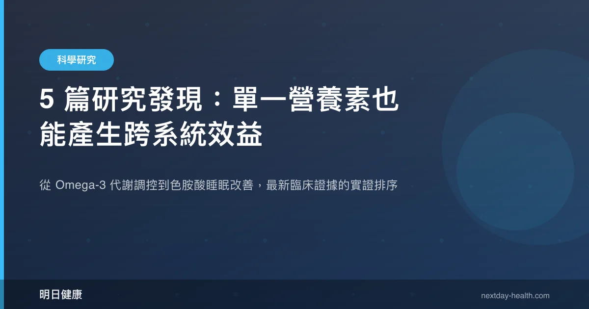 營養素是指人體維持生理功能所必需的化學物質,包括維生素、礦物質、胺基酸及脂肪酸等。近年臨床研究逐漸揭示,同一種營養素往往在多個器官系統中扮演角色,其效益範圍遠超過傳統認知的單一功能。本文彙整 5 篇涵蓋 Omega-3 脂肪酸、鎂、色胺酸、維生素 D 與維生素 B12 的最新臨床研究,從代謝、心血管、睡眠到眼科四大系統,梳理各營養素的實證強度與適用情境,為精準營養策略提供參考依據。