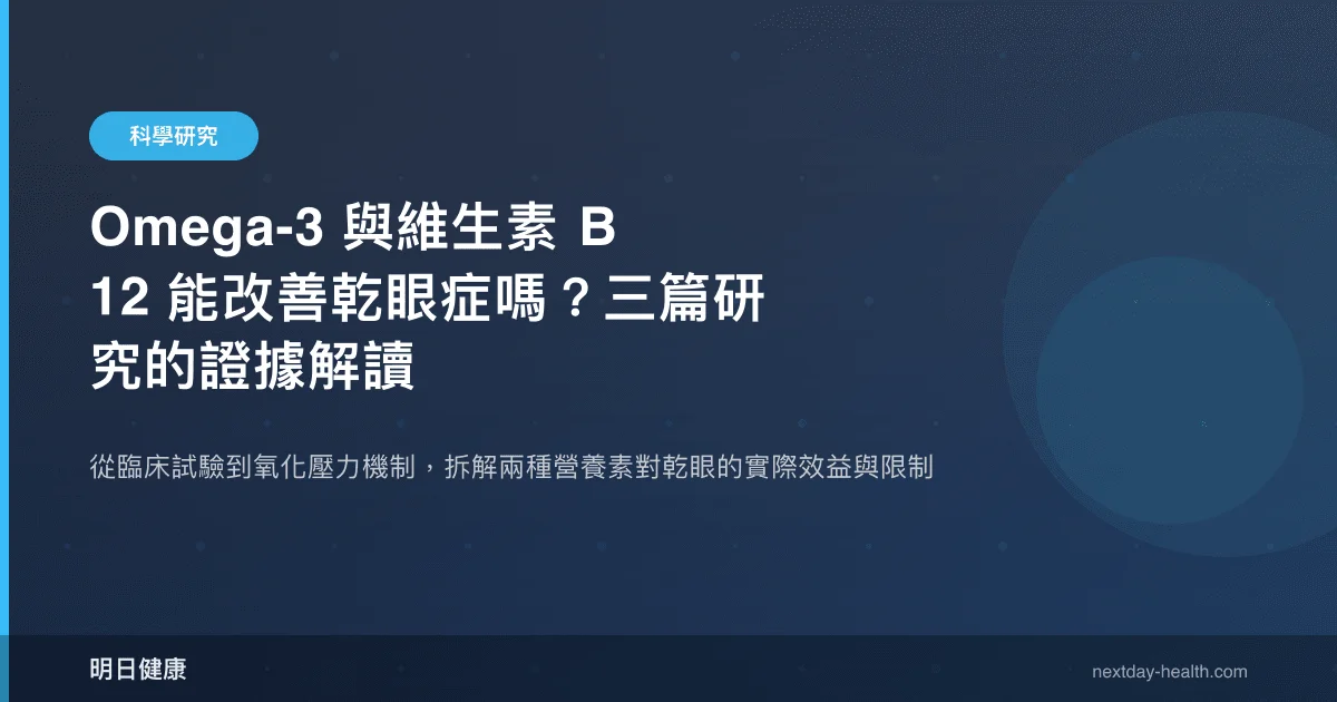 然而,「補充某種營養素就能改善乾眼」的說法是否有足夠臨床證據支持?本文彙整三篇不同類型的研究,從隨機對照試驗到觀察性研究,逐一檢視 Omega-3 與維生素 B12 對乾眼症及相關代謝指標的實際效益。
