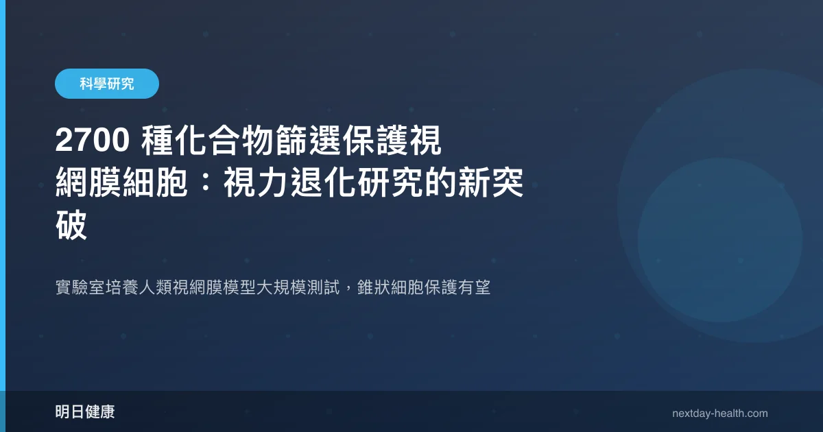 科學家在數千個實驗室培養的人類視網膜模型中,測試了超過 2,700 種化合物,尋找能保護錐狀細胞(cone cells)的候選藥物。錐狀細胞負責銳利視覺和色彩辨識,是黃斑部病變(AMD)和色素性視網膜炎(RP)等退化性眼疾中最易受損的細胞類型。