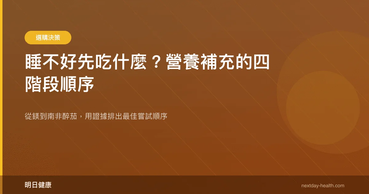 先從鎂和色胺酸開始。這兩種是身體本來就需要的基礎營養。鎂參與超過 300 種酵素反應,一項前瞻性研究發現,每日鎂攝取超過 320 mg 的人,全因死亡風險降低 22%(HR 0.78)。色胺酸是血清素和褪黑激素的原料,統合分析確認較高攝取量與更短的入睡時間顯著相關。你可以先從飲食補足,不夠再用補充劑。