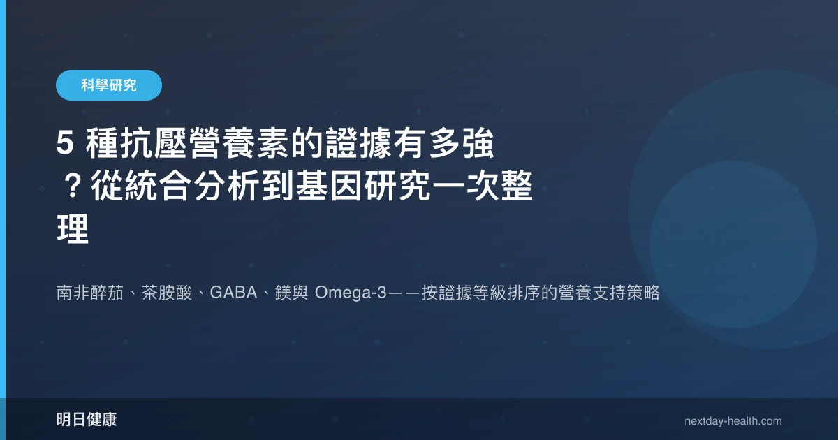 面對焦慮與壓力,消費者可選擇的營養補充品數量龐大,但各營養素的臨床證據品質落差極大。部分已有多項隨機對照試驗(RCT)與統合分析支持,部分則仍停留在觀察性研究或機轉推論階段。本文彙整 2022–2026 年間發表的 6 篇關鍵文獻,將南非醉茄(ashwagandha)、茶胺酸(L-theanine)、GABA、鎂(magnesium)與 Omega-3 脂肪酸依證據強度分級整理,協助讀者區辨「已獲強力支持」與「值得關注但仍需驗證」的營養策略。