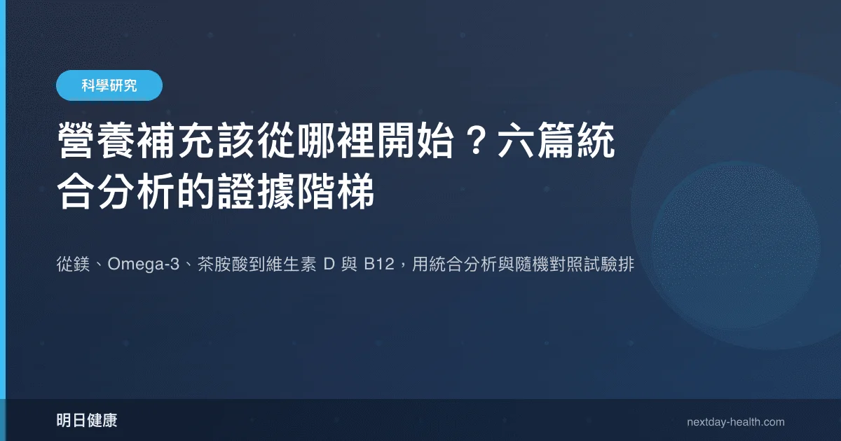 營養階梯(nutrient ladder)是指根據現有臨床證據強度,為不同健康目標排定營養素補充的優先順序。面對市場上數十種營養補充品,消費者最常問的問題是「該先吃什麼」。答案不在行銷文案,而在統合分析(meta-analysis)——這種匯集多項隨機對照試驗(RCT)的研究方法能提供最接近因果推論的臨床證據。本文檢視六篇近期發表的統合分析與 RCT,涵蓋鎂、Omega-3、茶胺酸、維生素 D 及維生素 B12 五種營養素,嘗試建立一套基於證據的補充階梯。