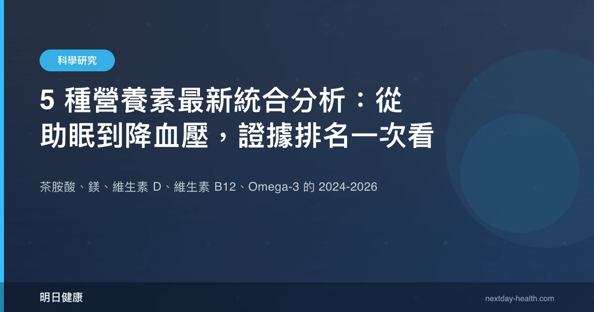 營養補充品的臨床研究每年新增數百篇,但多數消費者仍依賴過時的資訊做選擇。證據等級(Level of Evidence)是指根據研究設計的嚴謹度,對臨床發現給予的可信度分級,統合分析與系統性回顧位於最高層級。本文彙整 2024–2026 年發表的 6 篇關鍵研究,涵蓋茶胺酸(L-Theanine)、鎂(Magnesium)、維生素 D、維生素 B12 與 Omega-3 五種常見營養素,以統合分析與隨機對照試驗的數據為基礎,逐一檢視各營養素在特定健康面向的證據強度。