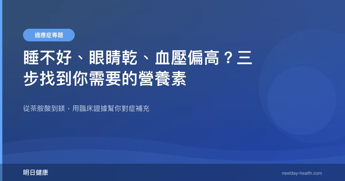你有沒有這種經驗——睡前翻來覆去、白天眼睛乾到不行、健檢報告血壓偏高?你知道可以補充營養素,但貨架上幾十種瓶瓶罐罐,到底哪一瓶才適合你?