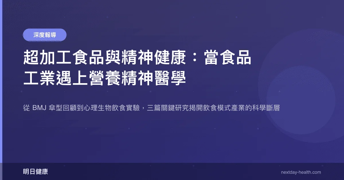 超加工食品攝取量最高的人群,憂鬱風險較最低組增加約 20%–50%(HR ≈ 1.20–1.50),且這層關聯在調整 BMI、身體活動量與社經地位後依然顯著。這是 Lane 等人 2024 年發表於 BMJ 的傘型回顧(umbrella review)所彙整的核心發現——該研究橫跨多個世代追蹤與橫斷面統合分析,建立起超加工食品與不良健康結局之間迄今最全面的流行病學圖像。