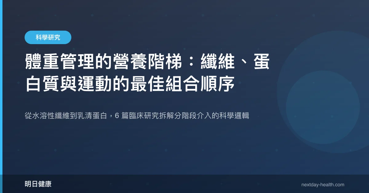 本文彙整 6 篇涵蓋水溶性纖維、乳清蛋白、大豆蛋白與運動介入的臨床研究,從血糖穩定、肌肉合成、抗發炎到情緒調節四個維度,拆解營養階梯的科學邏輯。