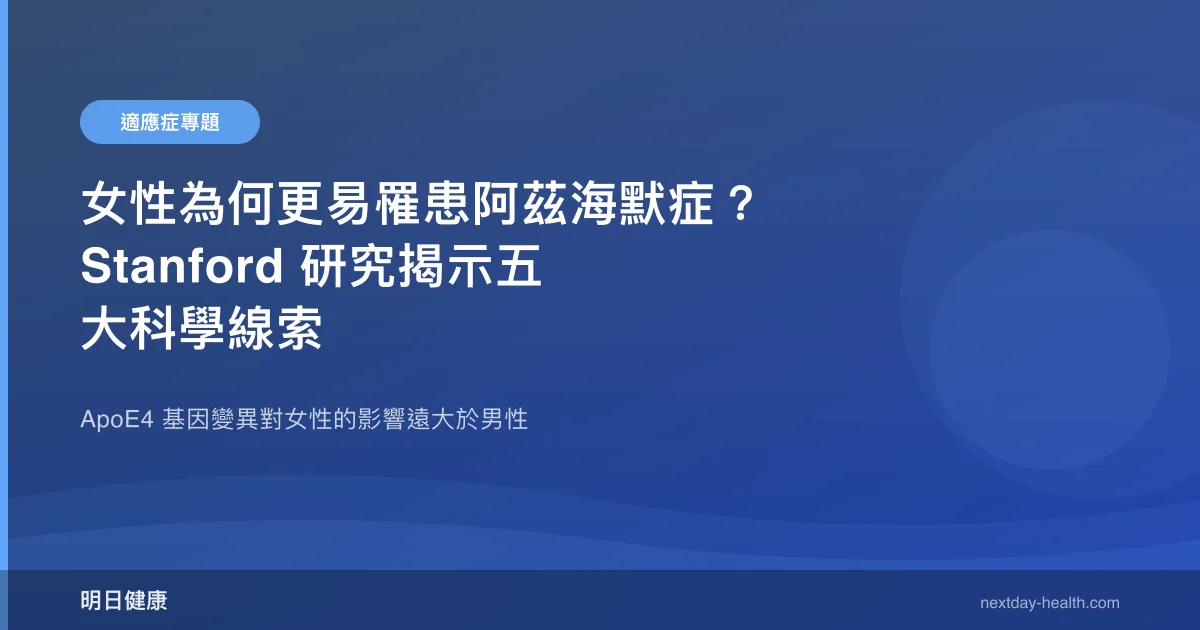 Stanford 研究團隊發現,攜帶 ApoE4 基因變異的女性,罹患阿茲海默症的風險顯著高於攜帶同樣基因的男性。ApoE4 是目前已知最強的晚發型阿茲海默症遺傳風險因子,約 25% 的人口攜帶至少一個 ApoE4 等位基因。這種性別差異的確切機制仍在研究中,但可能與荷爾蒙變化(特別是停經後雌激素急遽下降)對大腦的影響有關。