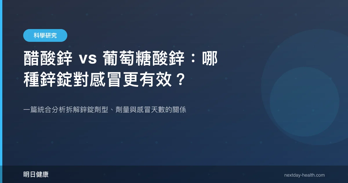 - 醋酸鋅錠效果較強,縮短感冒天數達 40%;葡萄糖酸鋅錠則縮短 28%(同上)。