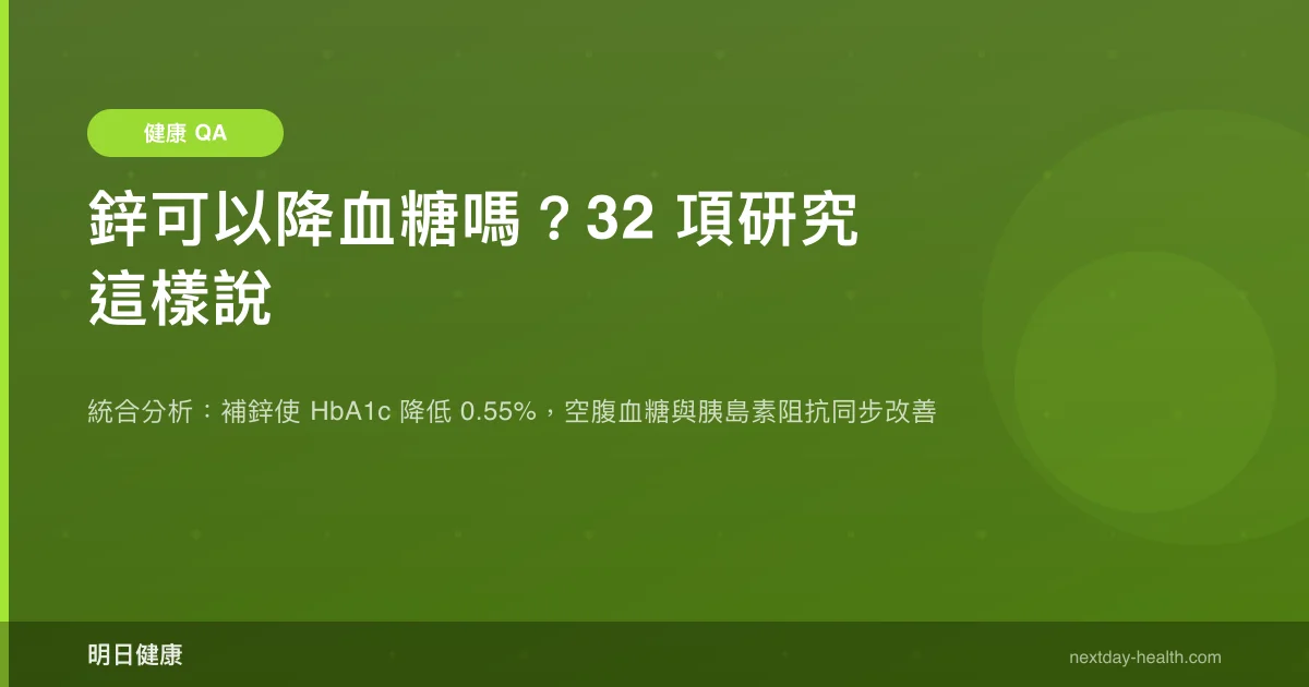 可以。鋅補充對血糖確實有幫助——一項統合分析匯集 32 項隨機對照試驗、共 1,700 位受試者,發現補鋅可讓糖化血色素(HbA1c)平均降低 0.55%,空腹血糖與餐後血糖也同步改善(PMID: 31161192)。
