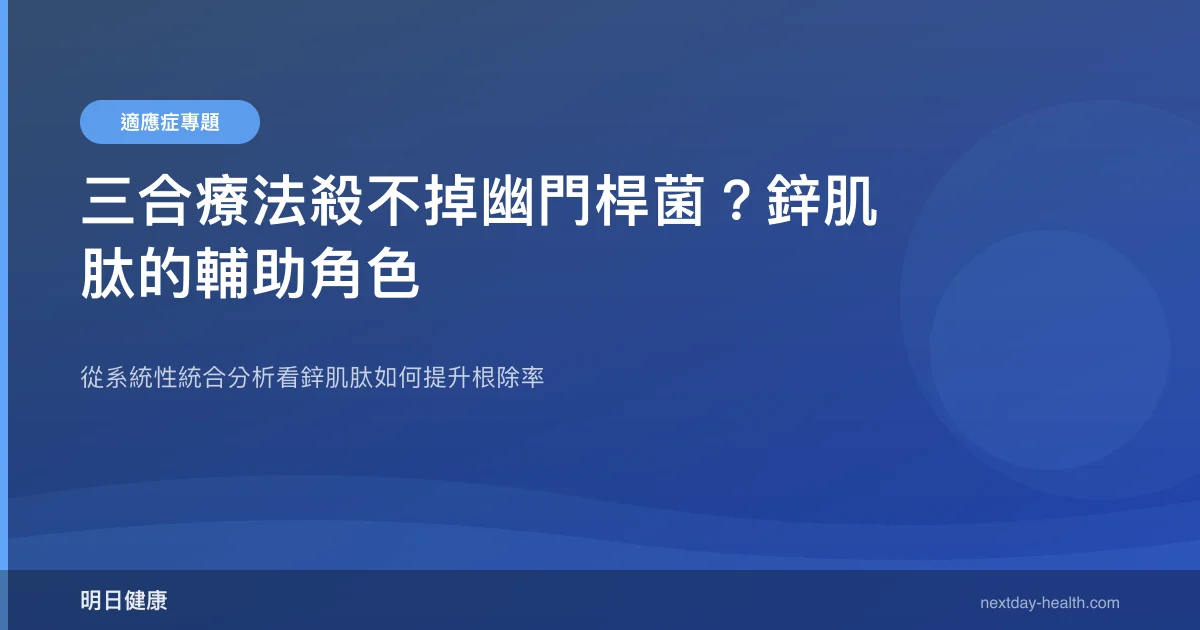 幽門螺旋桿菌根除治療失敗率逐年攀升,標準三聯療法(質子泵抑制劑+兩種抗生素)在台灣的成功率已降至70-80%。2022年發表於Nutrients期刊的統合分析顯示,以鋅肌肽(Polaprezinc)為基礎的四合療法,根除率可與標準療法相媲美甚至更優,為臨床提供新的治療選擇。