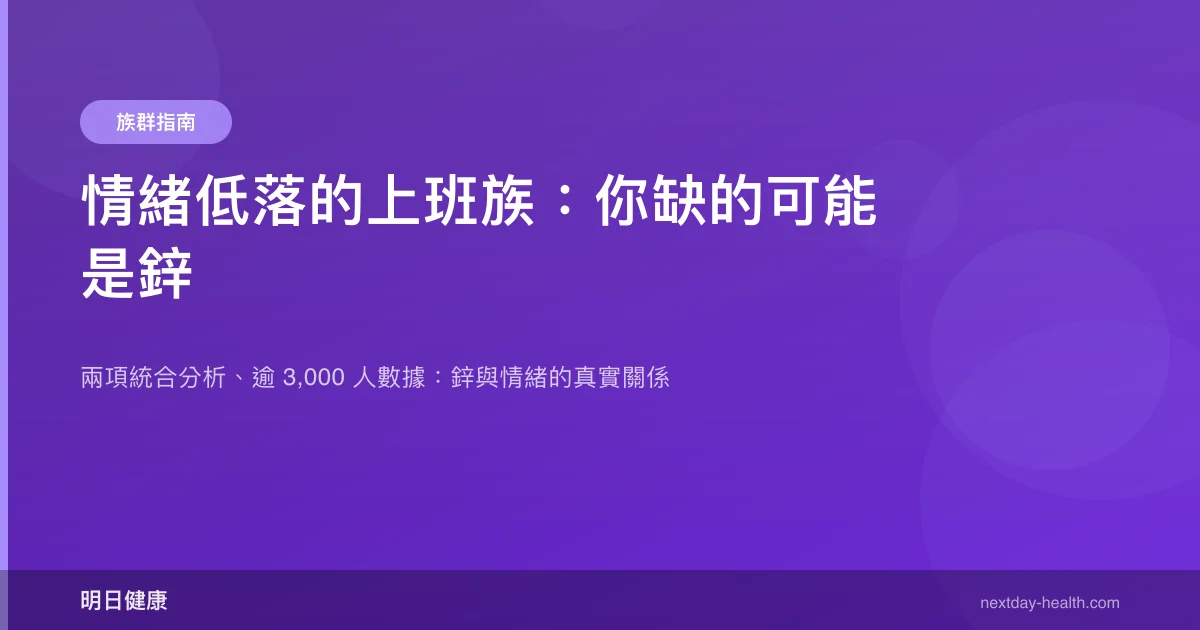 - 憂鬱症患者血鋅濃度平均比健康者低 1.85 µmol/L,效果量達中等程度(17 項研究、逾 2,400 人;Swardfager et al., 2013)