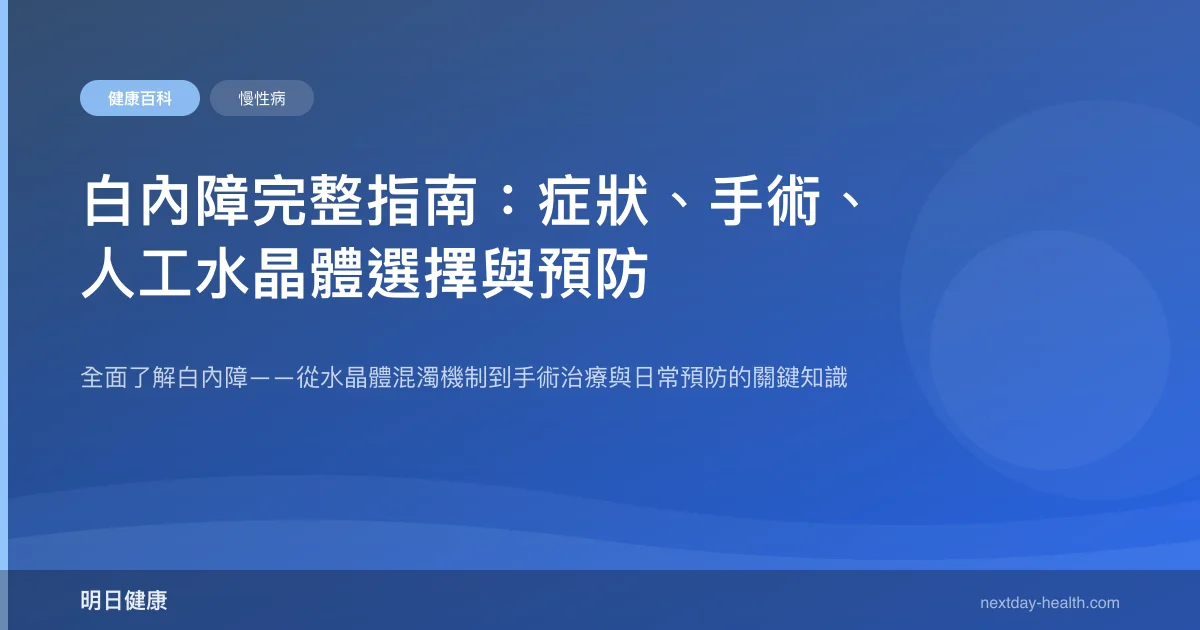 - 糖尿病:血糖控制不佳者白內障風險增加 2-5 倍,且發生年齡更早。高血糖導致水晶體內山梨醇(sorbitol)堆積,引起滲透壓改變和蛋白質糖化