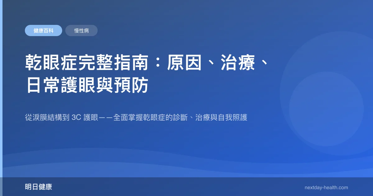 乾眼症(Dry Eye Disease, DED)是一種因淚液不足或淚膜品質不穩定,導致眼表損傷和不適症狀的多因子慢性眼表疾病,是 3C 時代最普遍的眼科問題之一。