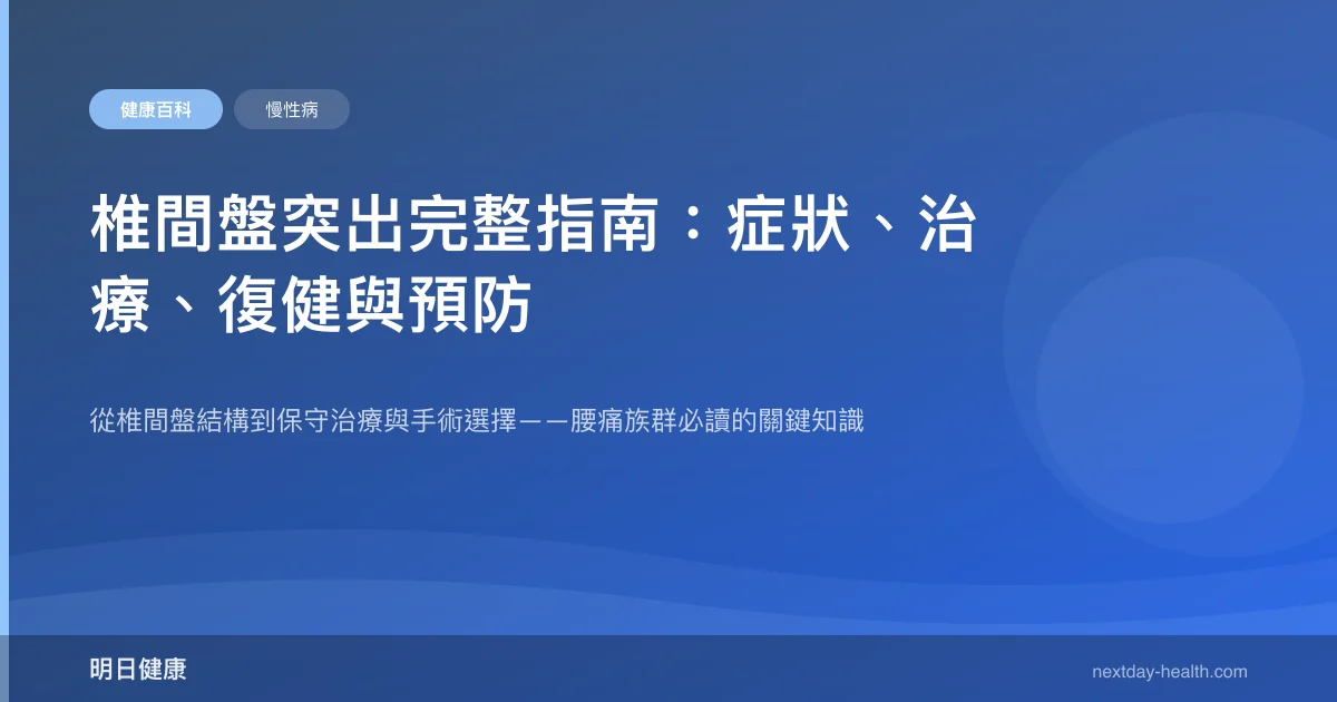 椎間盤突出(Herniated Disc,又稱椎間盤脫出或椎間盤疝出)是指脊椎骨之間的椎間盤組織因退化或外力,導致內部的髓核穿過外層纖維環裂隙向外突出,壓迫鄰近的脊神經根或脊髓,引發疼痛和神經症狀。