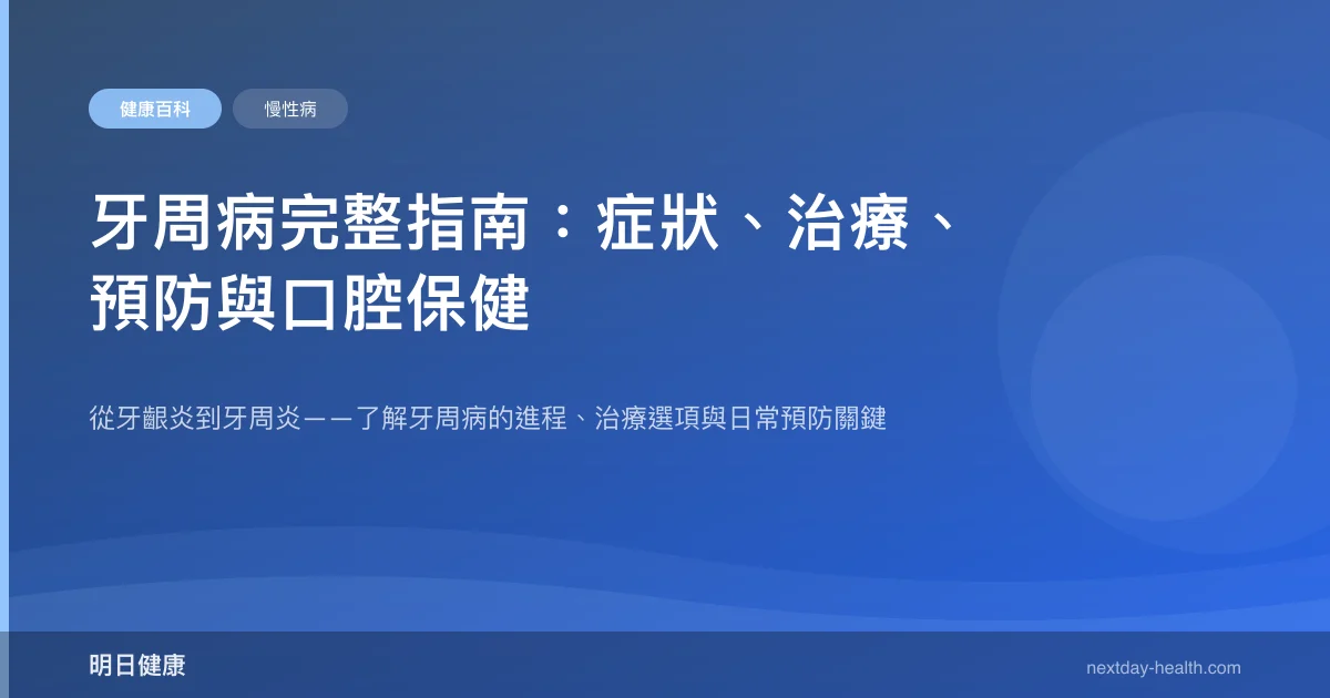牙周病(Periodontal Disease)是一組影響牙齒周圍支持組織的慢性感染性疾病,包括牙齦(牙肉)、牙周韌帶、齒槽骨和牙骨質。牙周病是全球最普遍的慢性疾病之一,也是成人牙齒脫落的首要原因。